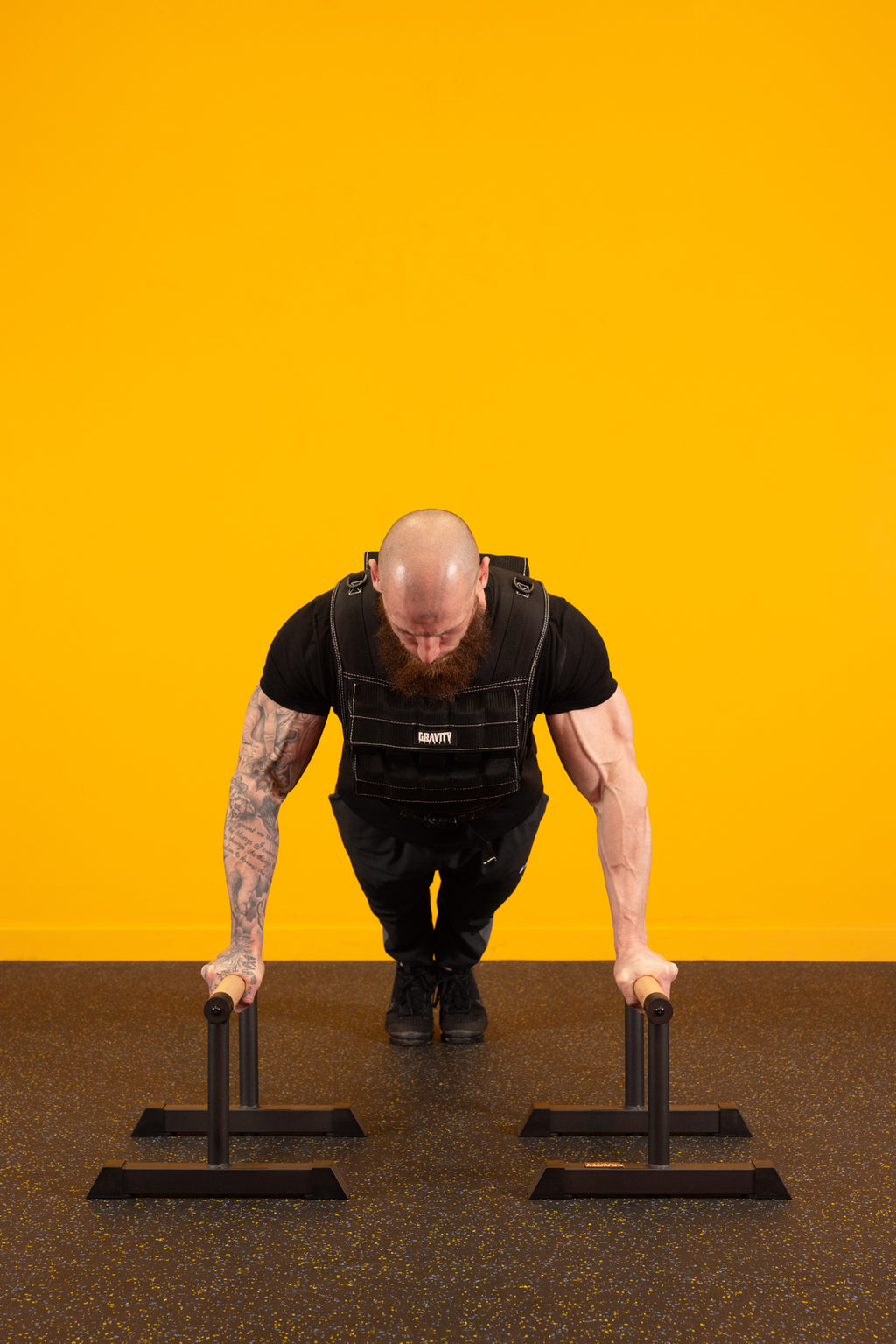 With a weighted vest (like Gravity’s 10–30kg range), parallettes become even more powerful.
