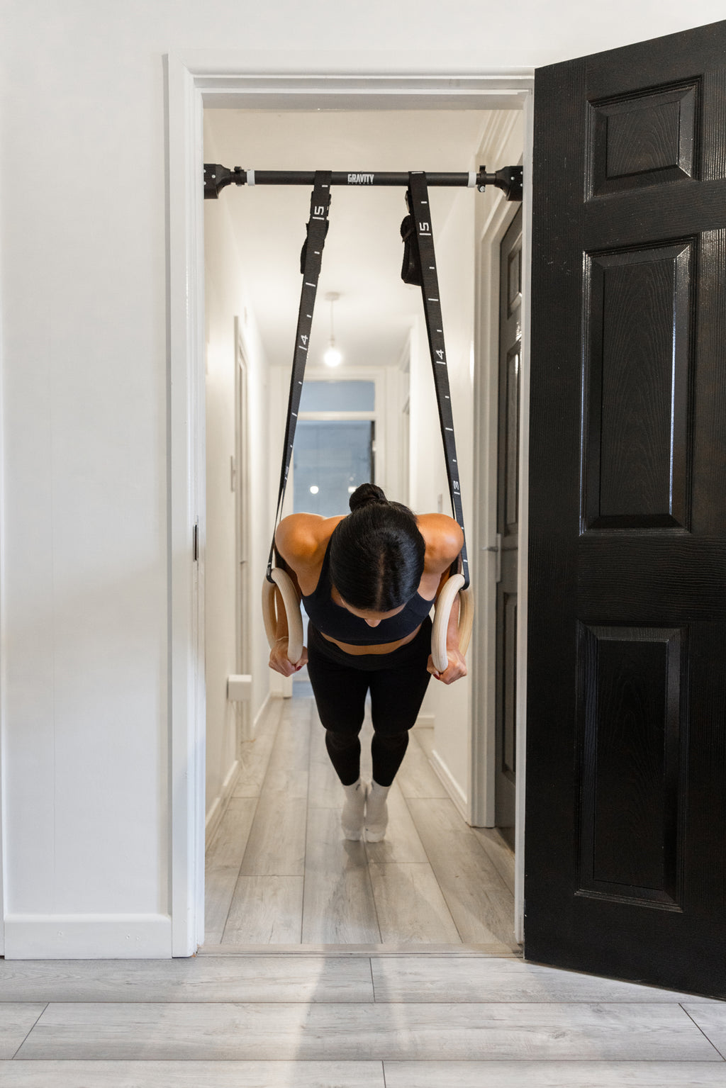 • Gymnastics Rings: Hang from your bar to train dips, rows, and stability drills